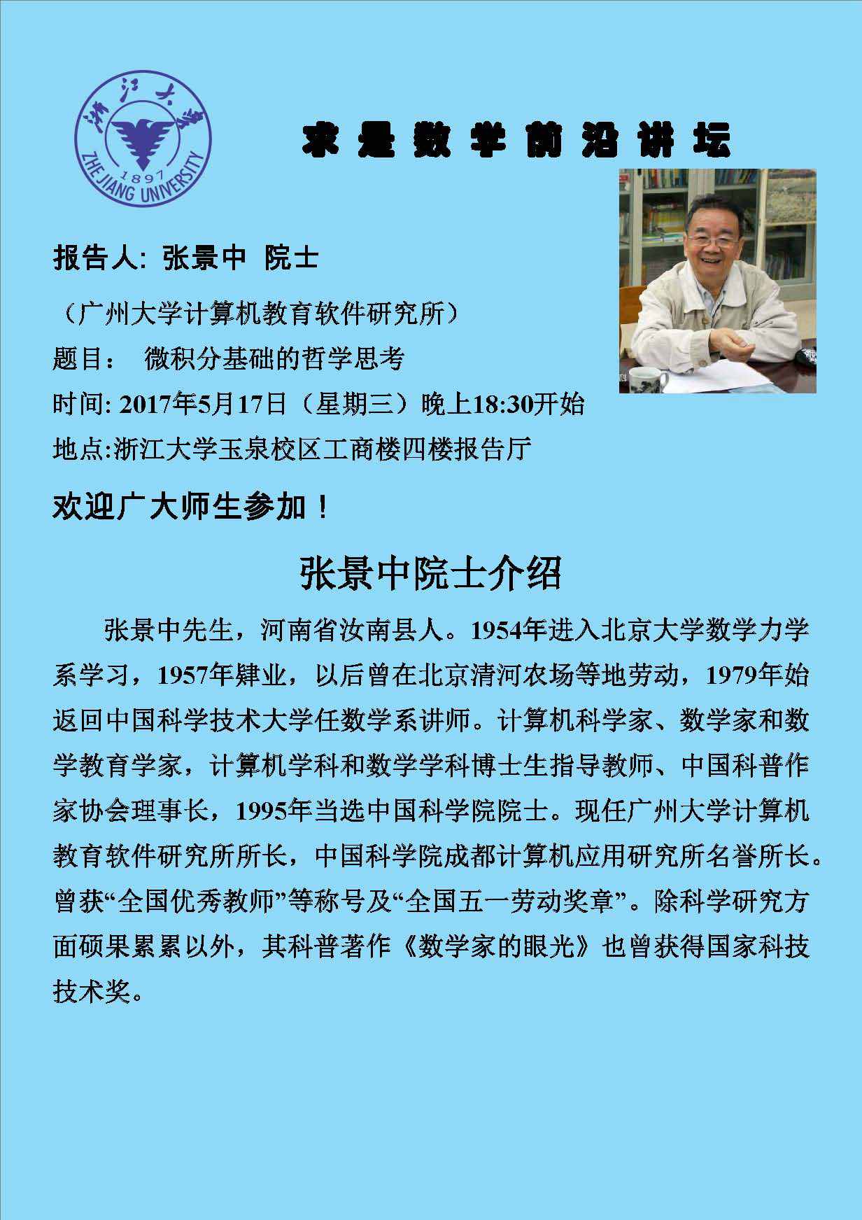 学术科研 学术团队 学术活动 学术会议 学术报告 讨论班 School Colloquium 信息公告 文件汇编 学术报告 乐竞官网平台 > (5月17日)张景中院士题为“微积分基础的哲学思考”的报告 来源:乐竞(中国)一站式服务平台 发布时间:2017-05-10 1003