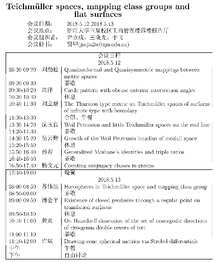 通知公告 通知公告 学术活动 学术会议 新闻图片 院系新闻 院内邮件 2018 乐竞官网平台 > Teichmüller spaces, mapping class groups and flat surfaces 来源:乐竞(中国)一站式服务平台 发布时间:2018-04-17 1719 会议日期: 2018.5.12-2018.5.13会议地点:浙江大学玉泉校区工商管理楼四楼报告厅会议组织者:尹永成、王晓光、于飞会议秘书:贾甲(jiajia2u@zju.edu.cn)标题和摘要,请见附件:标题和摘要.pdf