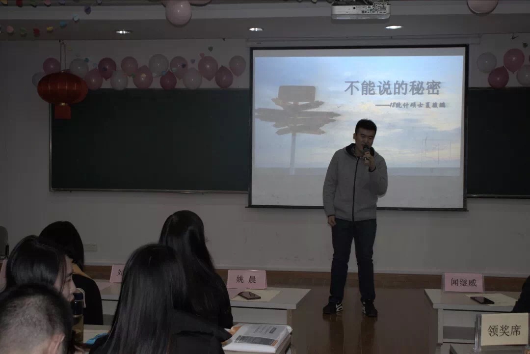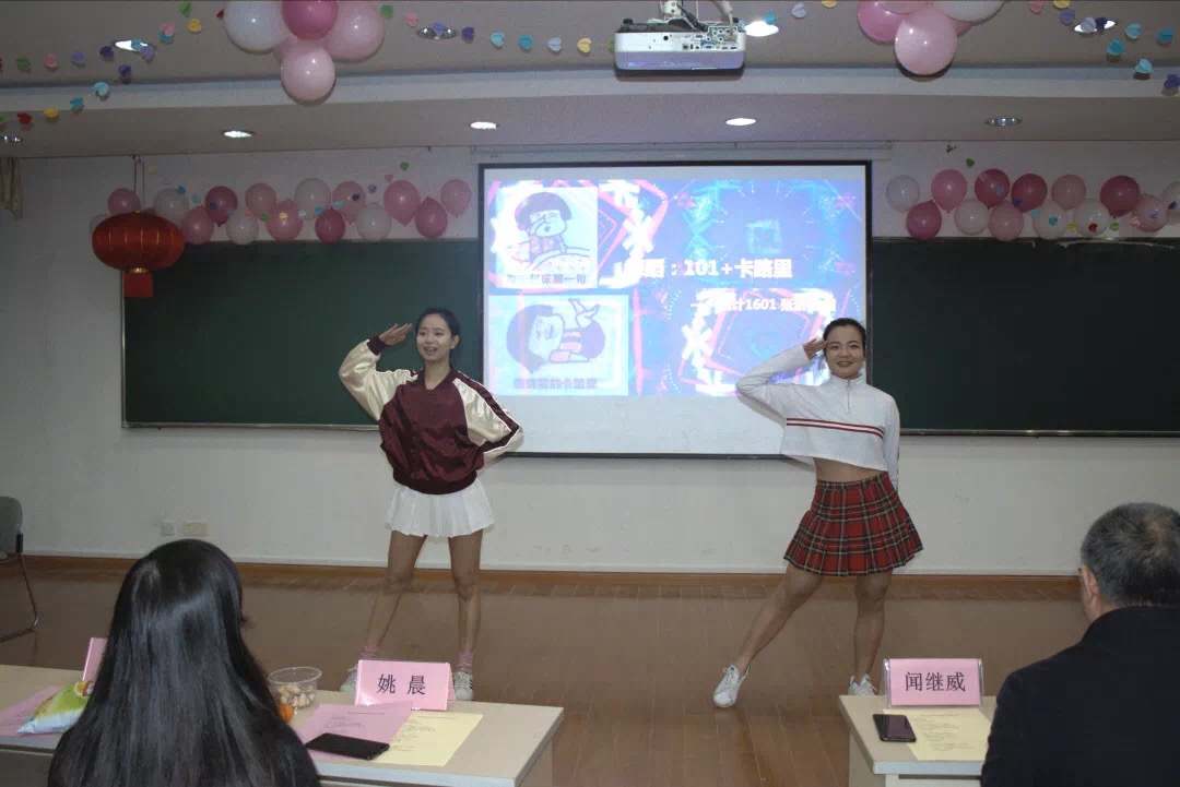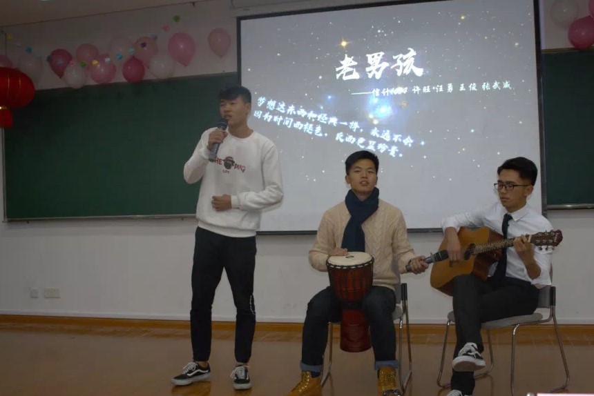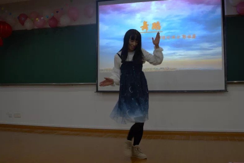 游戏和抽奖之后,精彩的表演继续进行。首先是信计1604班的许旺、王俊、张武威和汪勇同学带来了一曲《老男孩》,然后就是18级计算数学硕士班的郭林蔚学长带来的反串舞蹈《恋爱循环》。学长惊艳出彩的反串演绎赢得了现场观众的阵阵欢呼。本次新晚的文艺演出环节也在统计1701班同学们动人的歌声中画下了句点。