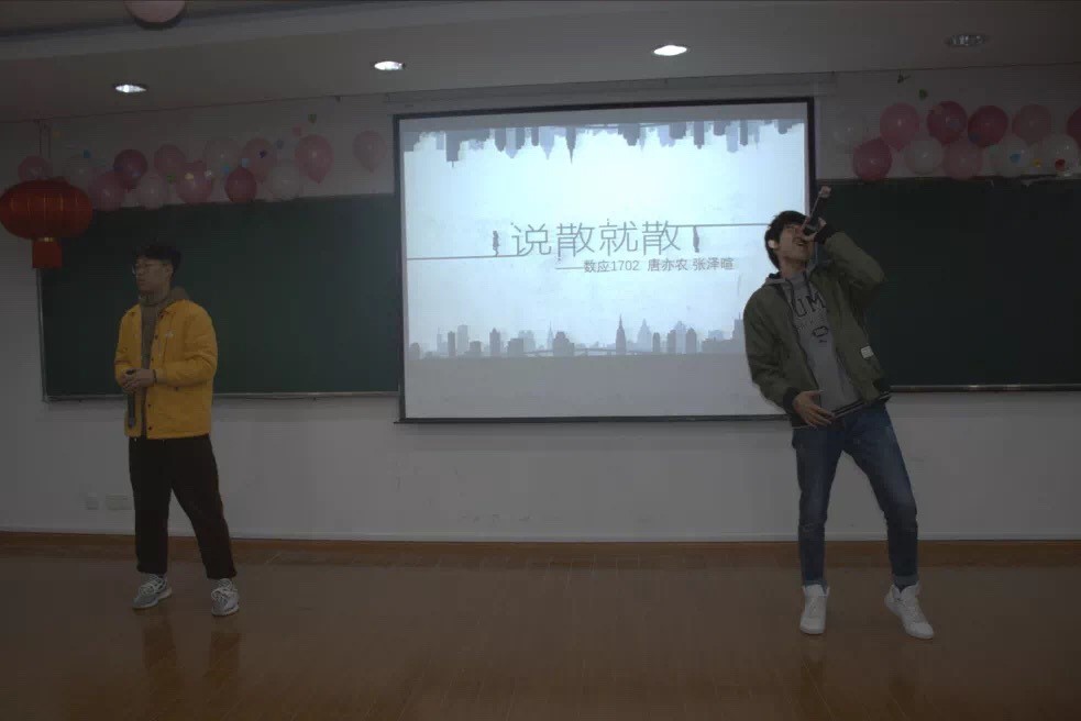 抽奖过后,来自数应17级的唐亦农和张泽暄同学表演了说唱版的《说散就散》。熟悉的歌曲通过新的音乐形式来呈现,令人耳目一新。数应1602班带来的话剧《灰小子》对经典的童话故事《灰姑娘》进行了“本土化”的改编,以幽默诙谐的叙述方式讲述了一个有关数学的喜剧故事,有趣的“数学梗”也博得同学们的阵阵欢笑。精彩的话剧节目过后,18级基础数学硕士班的崔星华学长倾情献唱《lemon》,18级博士二班的李晓雯学姐也带来了充满活力的单人舞《pop star》。随后现场又进行了第二轮的游戏环节和抽奖,这次猜糖水浓度的游戏活动也吸引了现场老师的踊跃参与,又一轮幸运儿的抽奖也将气氛推向了高潮。