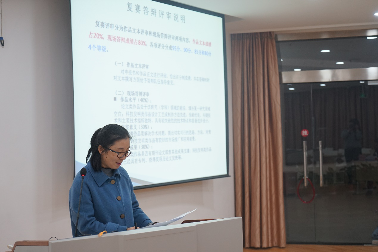 正式答辩开始前,姚晨老师为本次复赛致辞。她向在座的老师同学们介绍了挑战杯竞赛并感谢各位评委老师在百忙之中莅临指导,希望各参赛队伍通过答辩展示优秀项目,在交流中相互学习、共同提高,祝愿本届比赛圆满成功!
