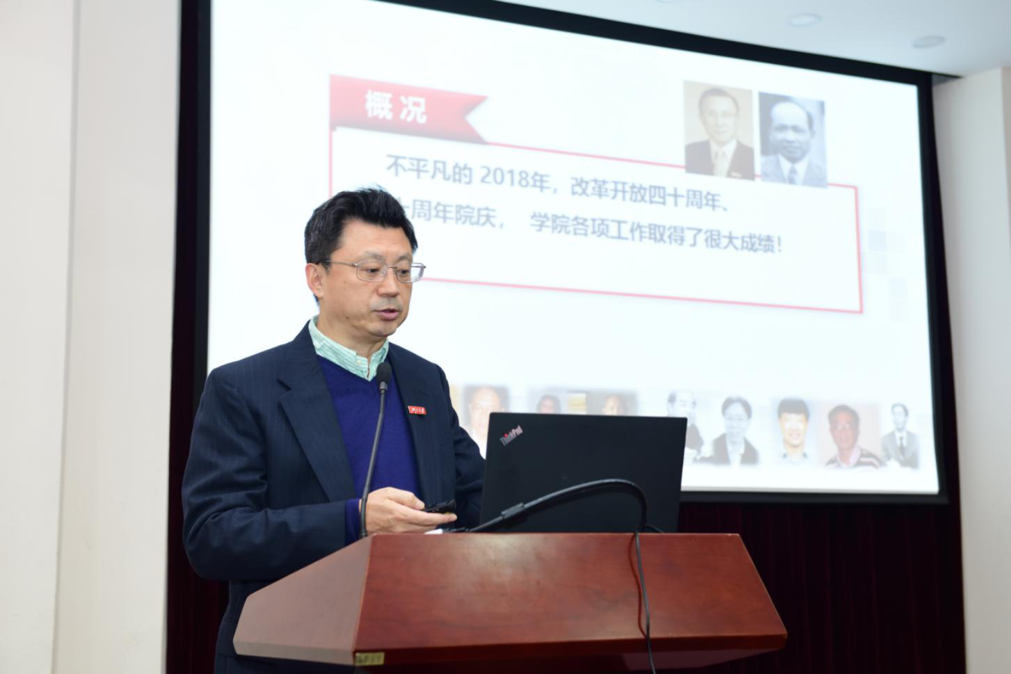 在集体奏唱国歌声中,大会拉开序幕。包刚院长首先对乐竞(中国)一站式服务平台2018年的工作进行了全方位总结,他从党建工作、院庆系列活动、教学科研工作、国内外影响力等方面回顾了学院在过去一年中取得的诸多成绩与进步。同时也结合学院现状,分析阐述了学院在“双一流”建设中所面临的形势和任务,并对学院未来的发展做出了进一步的规划和展望。