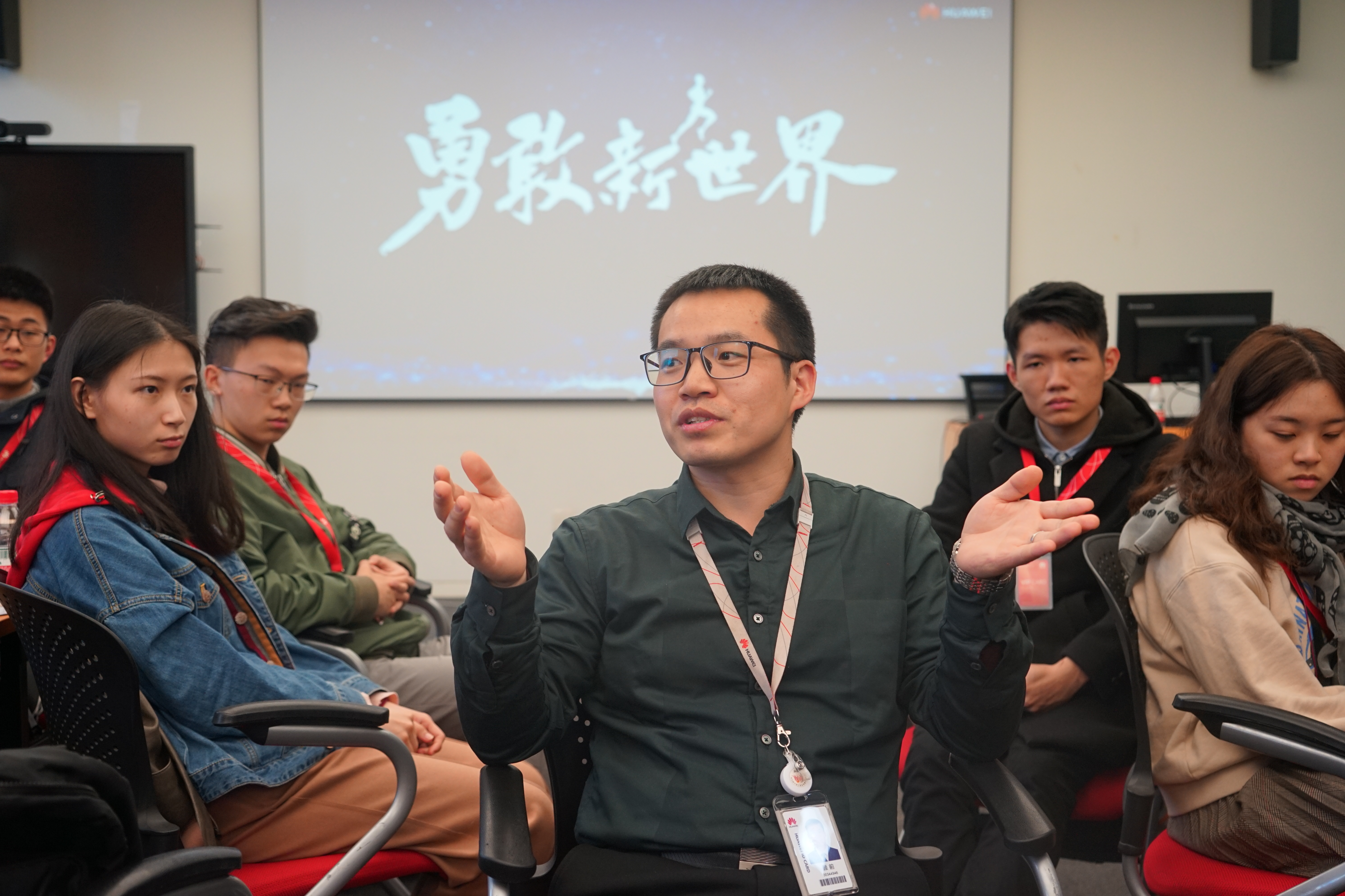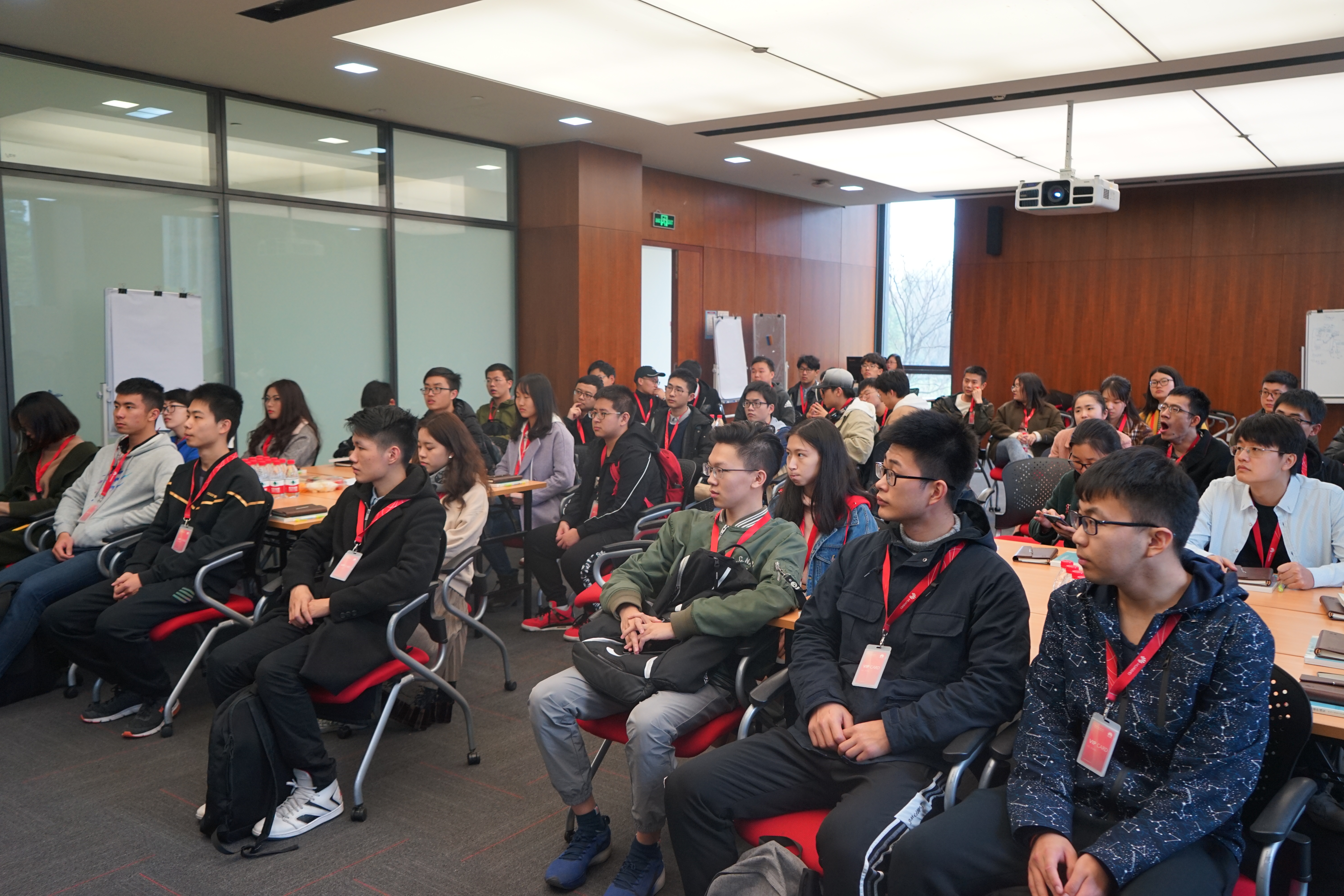 经过40分钟的车程,参观人员抵达了位于滨江区江虹路的华为杭州研究所。早已在园区等候的顾老师和郭老师为同学们发放通行身份牌,并带领大家前往交流会议室。在会议室内,顾老师为大家介绍了华为公司的发展沿革、公司定位、产品方向、全球基地和人才培养。顾老师强调,华为对人才的培养模式是创造性的,它欢迎员工跨专业跨方向尝试不同职位,鼓励员工挑战自我发挥潜能,提供优厚的薪资和各类福利保障员工的生活条件。他还强调,华为公司始终重视技术的转移和开发,力求与高校、研究机构等建立合作关系,努力实现知识的产业化。