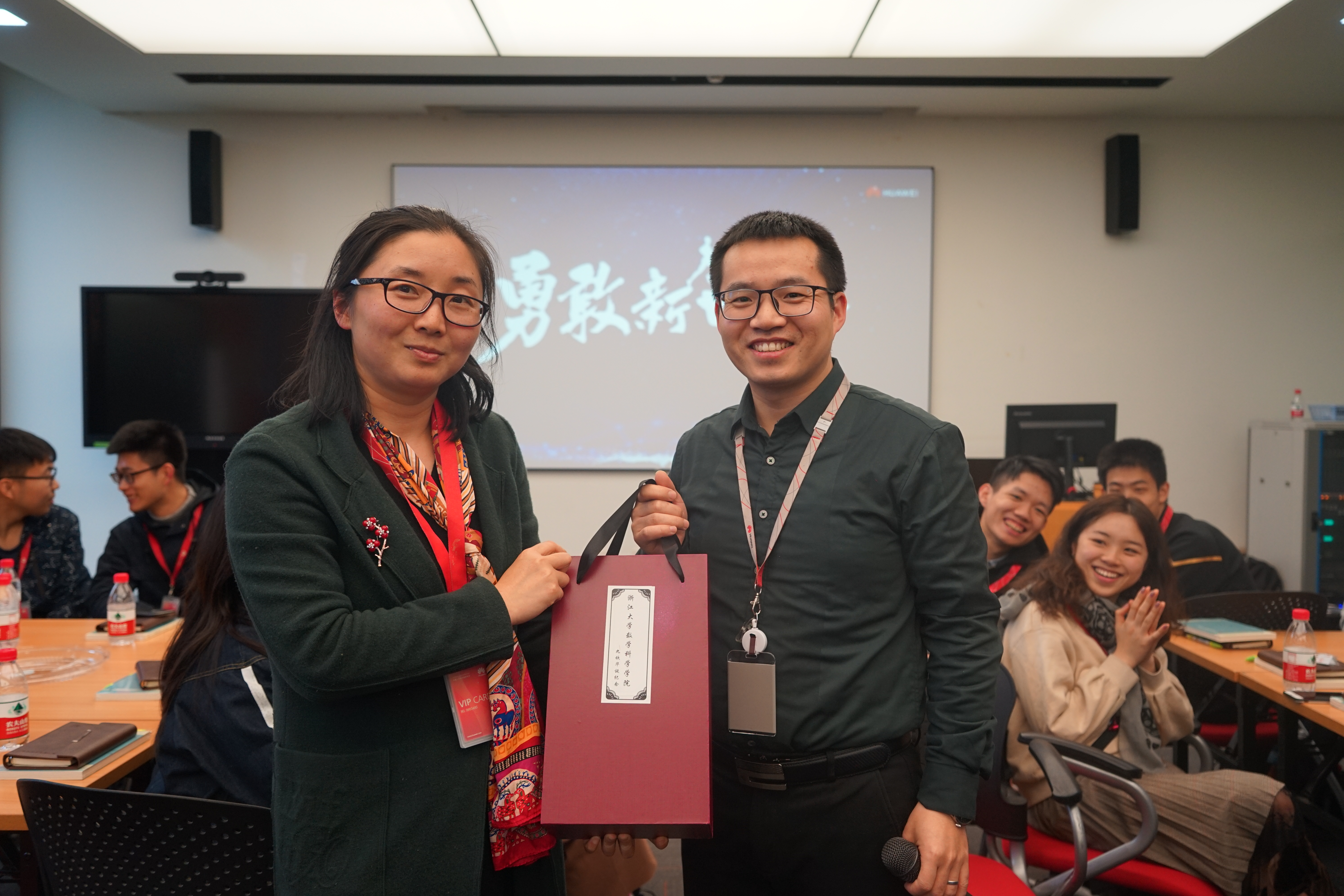分享会的最后,李萌老师献词对华为的参观邀请表示感谢,由陈卫老师代表学院送上精心准备的院庆纪念品。