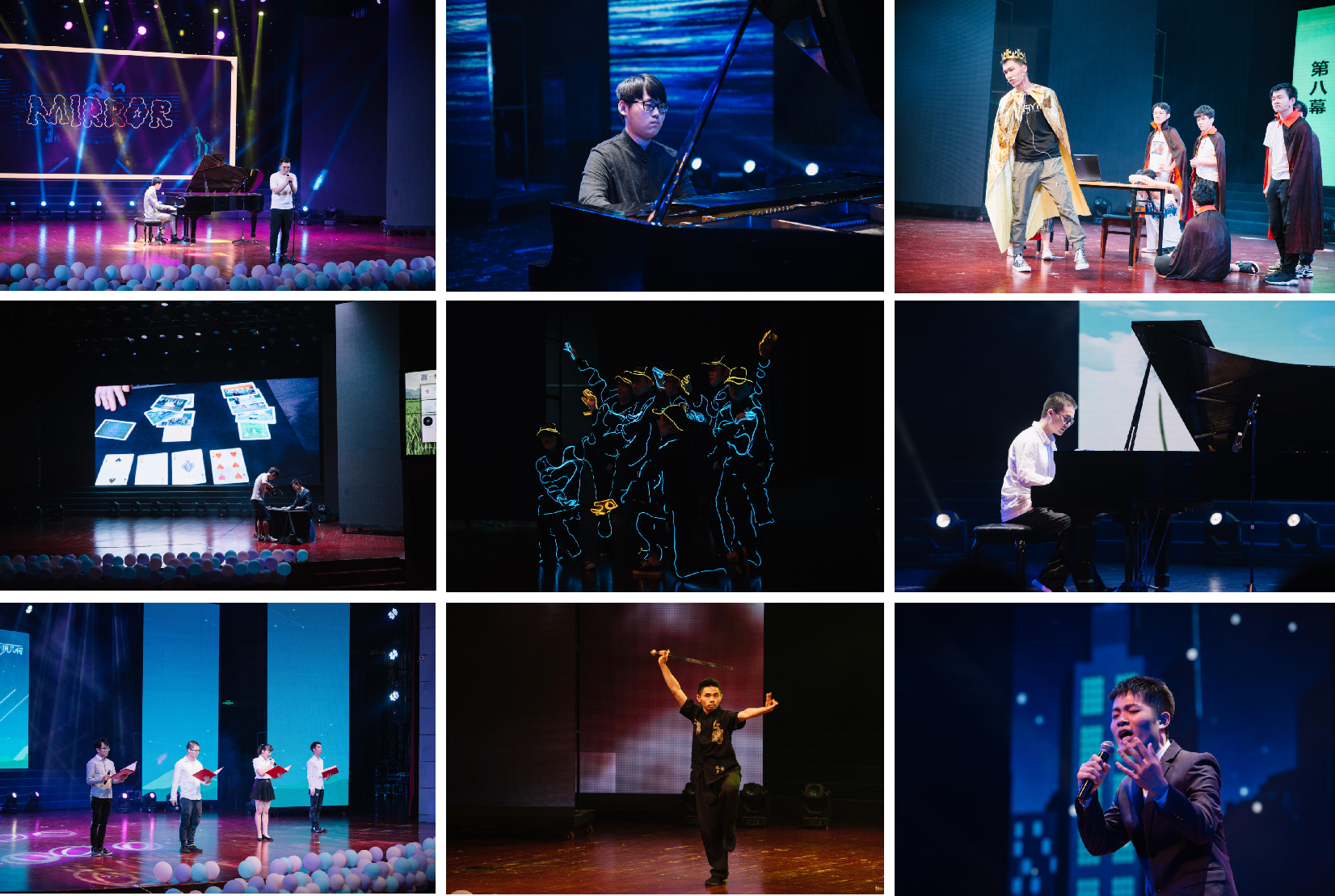 晚会各个篇章节目独具匠心、别具一格,为全场观众带来了身心愉悦的观赏体验。原创歌曲《琴禾店》、个人独唱《旅行》《车站》令全场沉醉,动人的歌喉激起了此起彼伏的掌声;钢琴独奏《平湖秋月》化无形的旋律为有形的胜景,引全场观众渐入佳境;值得一提的是,张庆海老师的太极剑表演一登场便引起全场欢呼,“来如雷霆收震怒,罢如江海凝清光”,潇洒的身影和如虹的剑气令全场沸腾,掌声如雷鸣;此外,16级同学自创自导自演的情景剧《白雪公主新编》、陈嘉烨同学惊艳全场观众的魔术表演《destiny》、研博会同学深情的诗朗诵《九秩华诞赋》、信计1501张庆海老师与班级全体同学带来的夜光舞《handclap》同样为晚会添上浓墨重彩的一笔。
