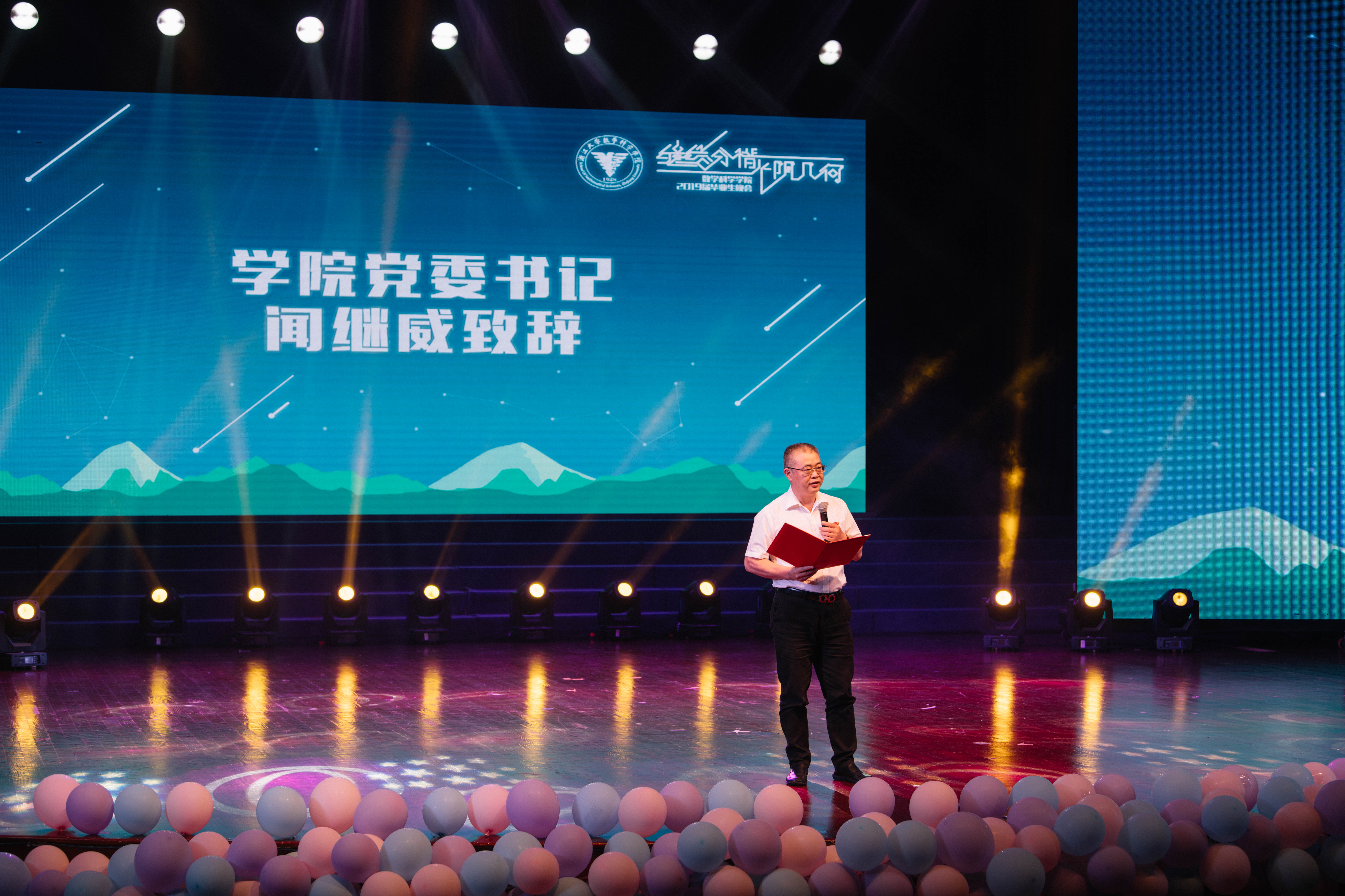 2019年6月9日晚,乐竞官网平台“缱绻分惜,光阴几何”2019届毕业生晚会在永谦剧场隆重举行。学院党委书记闻继威,副院长盛为民,党委副书记姚晨,院长助理、数学系系主任张挺,院长助理、应用数学系系主任徐翔,统计学系系主任张朋,信息与计算科学系系主任张庆海等三十余位老师莅临本次晚会,一同见证2019届毕业生从求是园扬帆启航,奔赴更广阔天地这一庄重时刻。