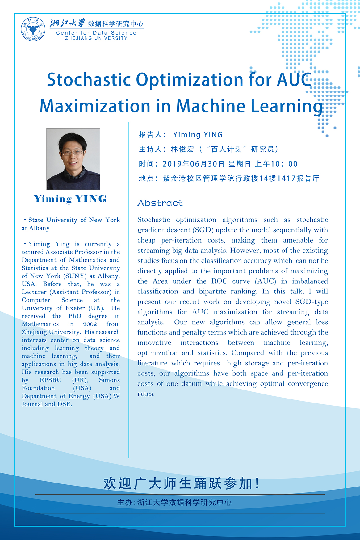 学术科研 学术团队 学术活动 学术会议 学术报告 讨论班 School Colloquium 信息公告 文件汇编 2019 乐竞官网平台 > Stochastic Optimization for AUC Maximization in Machine Learning 来源:乐竞(中国)一站式服务平台 发布时间:2019-06-26 730