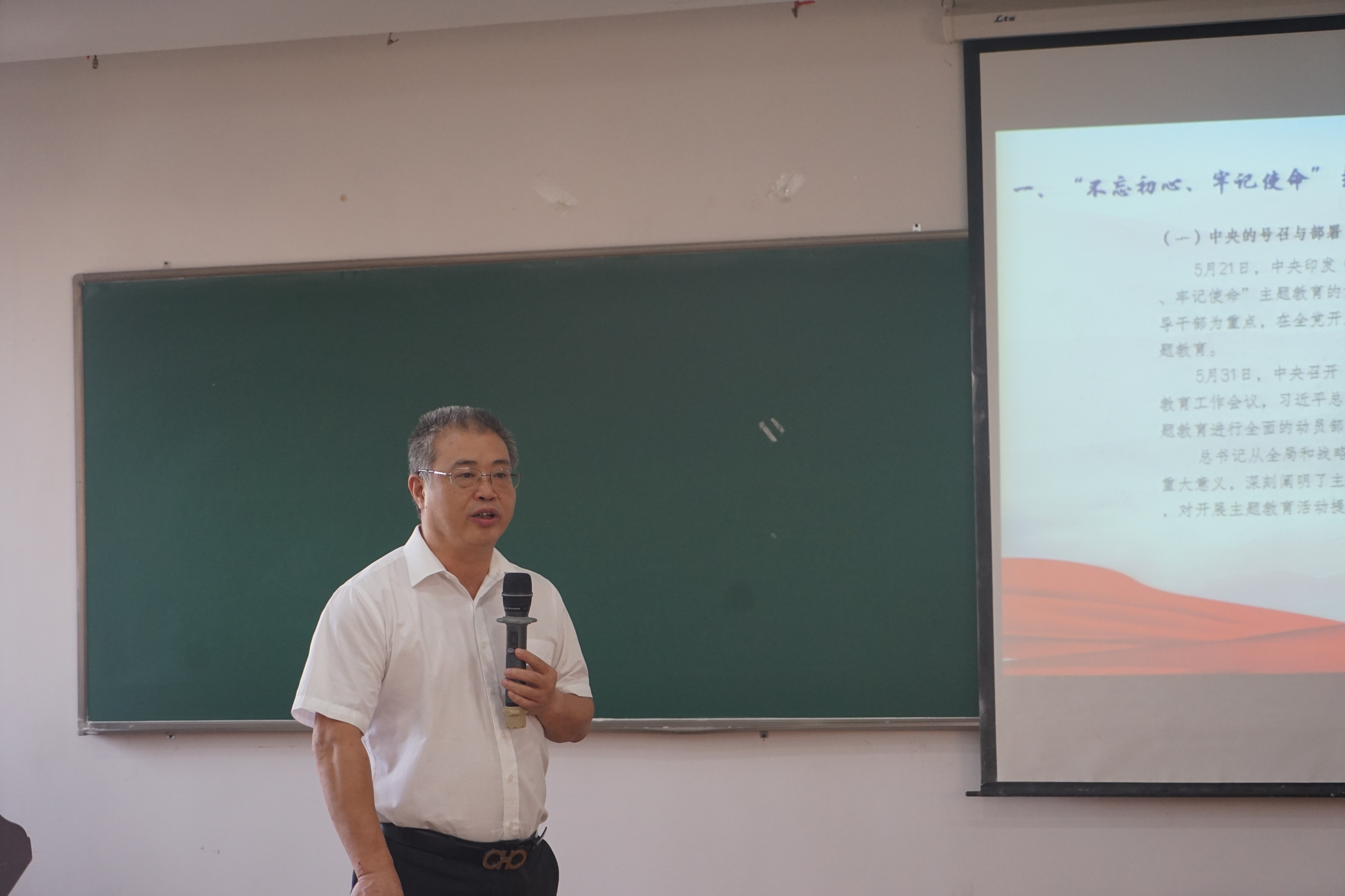 首先,学院党委书记、副院长闻继威向党员们作《铸魂育人,争锋一流――深入推进“不忘初心、牢记使命”主题教育活动》专题报告。闻书记从“中央、省委、学校‘不忘初心、牢记使命’主题教育总体要求”、“学院关于‘不忘初心、牢记使命’主题教育活动实施方案”两个方向进行详细解析。闻书记强调通过本次主题教育,要做到“班子动起来,支部动起来,党员动起来”、“问题找出来,差距找出来,责任找出来”、“风气改过来,规矩改过来,生态改过来”,达到“班子团结奋进”、“支部规范有力”、“党员正气有干劲”的目的。同时,闻书记提出学院将从六个方面对主题教育进行贯彻落实,分别为:以学习提高认识,统一思想,加强班子建立,夯实党支部基础;以调查研究找差距,抓落实;以思想引领学院新风尚;以特色创新彰显学院风貌;以宣传推动学习热潮;以检视剖析问题根源。