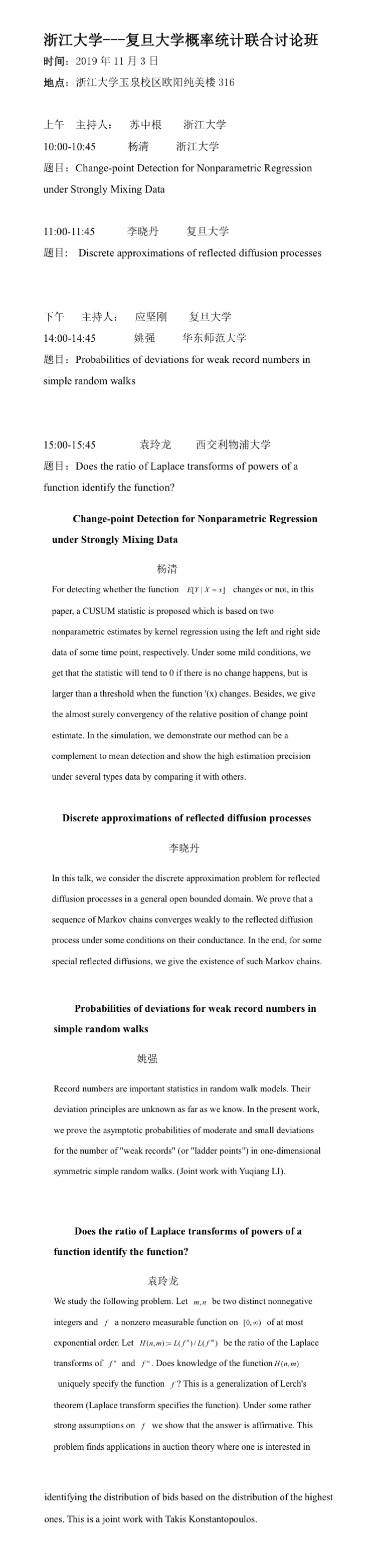 通知公告 通知公告 学术活动 学术会议 新闻图片 院系新闻 院内邮件 2019 乐竞官网平台 > 浙江大学---复旦大学概率统计联合讨论班 来源:乐竞(中国)一站式服务平台 发布时间:2019-12-28 1842