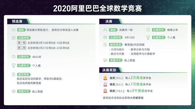 通知公告 通知公告 重要通知 本科生 研究生 科研 教学 人事 公示 学术活动 学术会议 新闻图片 院系新闻 院内邮件 研究生 乐竞官网平台 > 关于2020年阿里巴巴全球数学竞赛启动报名的通知 来源:乐竞(中国)一站式服务平台 发布时间:2020-03-06 5089 各位同学大家好:2020年阿里巴巴全球数学竞赛已经全面开启接受报名,第一轮预选赛将于北京时间2020年3月14日早上8点开赛。下图是本届比赛的详细介绍。大赛报名地址:https://damo.alibaba.com/alibaba-global-mathematics-competition,请同学们积极参与,