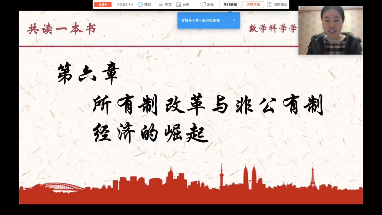 唐梦迪同学分享了第六章《所有制改革与非公有制经济的崛起》。她主要从两次重要的会议探讨了公有制经济和非公有制制经济地位的确立以及发展过程。谈到非公有制经济的地位时,她从改革开放前夕到2001年底个体经济和私营经济的数量对比图,以及GDP占比上入手,认为非公有制经济是社会主义市场经济的重要力量,在拓宽就业渠道、满足多样化需求方面有着很大的贡献。她还提到,非公有制经济的发展并不是一帆风顺的,还面临着诸如思想观念落后、歧视性政策法规等制约因素的挑战。最后,她提到了一些为大力发展和引导非公有制经济发展而需要做出的措施,让同学们进一步认识非公有制经济的现状与发展。