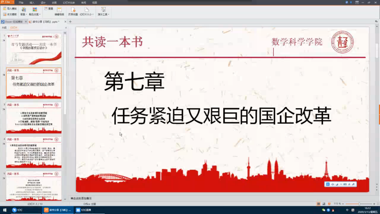 冯帆同学对第七章《任务紧迫又艰巨的国企改革》进行了分享。他从国企改革的理论突破、国有资产管理和针对垄断的举措等方面介绍了国企改革的历程和前路。在讲到国有资产管理时,他分析了长期以来存在的“五龙治水”、政企不分等问题,进而明确了国有资产管理改革的三大目标,即明晰产权,出资人到位;对国有经济有进有退的调整和资产重组;以及实现国有资产的保值增值。他还列举了大家身边随处可见的例子来介绍不同的垄断及其对应措施,让大家深入了解我国垄断行业的改革现状。最后冯同学用一些数据总结了国企改革之路,让同学们有了一个整体的把握。