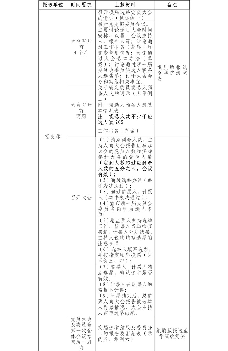 (二)各党支部要做好充分准备,在认真总结支部工作的基础上,进一步统一思想、凝心聚力,明确今后一个时期的工作任务。通过换届工作,推进基层党支部标准化规范化建设,不断提高党建工作水平,将全面从严治党责任落到实处。
