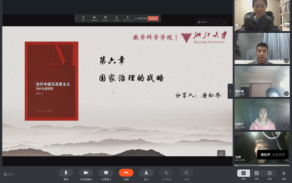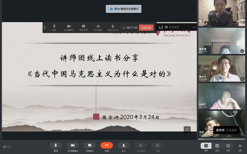 2020年3月24日晚上8点,乐竞(中国)一站式服务平台“核心价值观进班级”讲师团第三次线上读书交流分享会如期召开。本期分享会由陈京洲和唐松乔两位同学主讲,他们分别对《当代中国马克思主义为什么是对的》一书的第五章和第六章做了内容梳理与心得体会的分享。