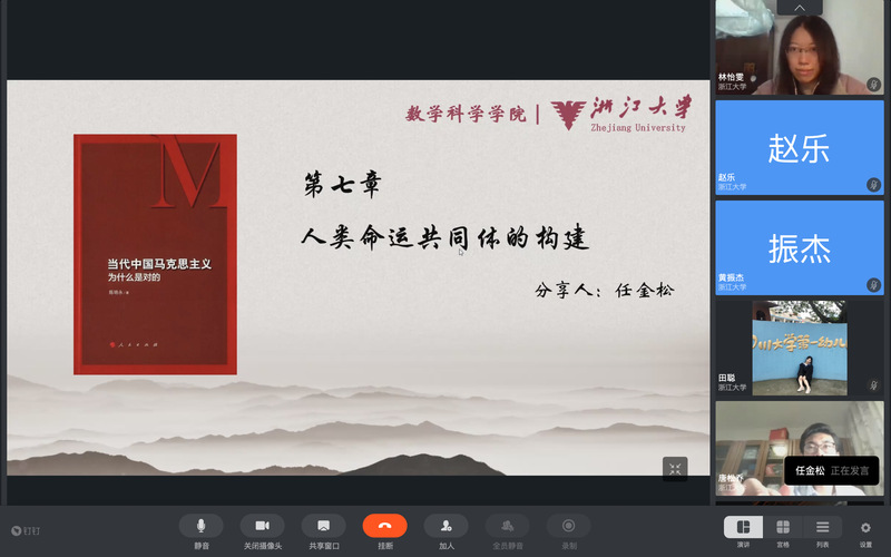 任金松同学围绕“人类命运共同体”这个主题,结合当下疫情,分享了自己的读书心得。对于全球化这个问题,要辩证地去看待,一方面,全球化并不是完全一片光明的,而是伴随着问题和代价的;另一方面,不能全面否定资本主义带来的世界历史的进步性。任金松同学详细地阐释了习近平总书记关于命运共同体的“五观”的概念——权力观、利益观、文明观、安全观、发展观,分享了自己对“和而不同,兼容并蓄”的理解。本次疫情也充分体现了“人类命运共同体”的特点,面对灾难,没有一个国家、没有一个人可以置身事外,只有以开放包容的心态合作共通,才能战胜疫情。