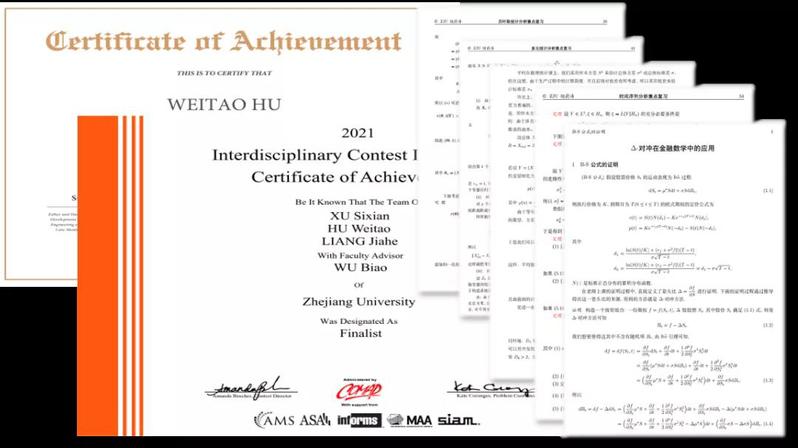 在国际性大学生数学建模竞赛(MCM)中,他负责统计模型分析、模型构建、有效性检验,也统筹带领小组成员精诚配合,获Finalist特等奖提名奖项,列居前5%。