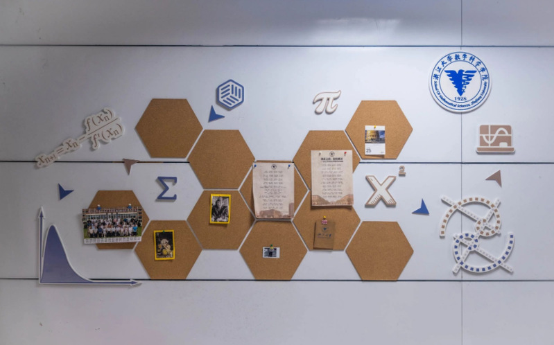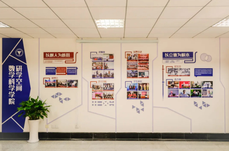 学院党建工作坚持全面从严治党,抓实“两学一做”及“三会一课”制度规范化建设,发挥基层党组织战斗堡垒作用;加强党员思想建设,深化落实学院各类特色党建平台教育功能。基于此,墙面分为上下两部分,分别展示数学学院八个研究生基层党支部的合照和学院党建特色活动。