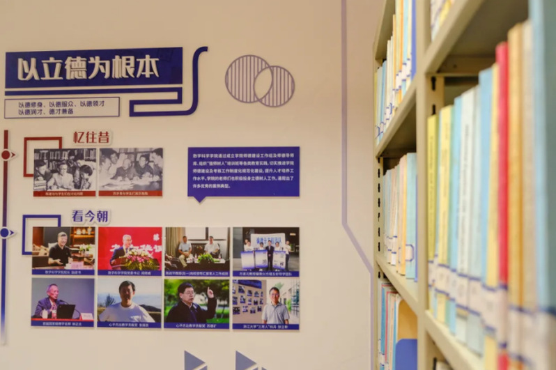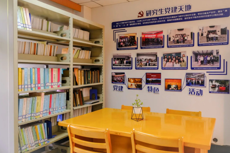 研习空间墙面分别以思政和党建为主题装饰。习近平总书记曾提出:“要把立德树人内化到大学建设和管理各领域、各方面、各环节,做到以树人为核心,以立德为根本。” 基于此,墙面以“以树人为核心,以立德为根本”为主题分为两块内容。前者以近年学院思政工作成果为主,分别展示了学院学生会、讲师团和青马学院这三个学生组织的活动,以及近年来学院组织的品牌活动和学生获奖风采,充分表现学院坚持以“铸魂育人”为首要原则的“树人”理念。后者则展示了从古至今的学院教师典型案例,这是“陈苏精神”的传承,也是学院切实推进学院师德建设、提升人才培养工作水平的“立德”决心。