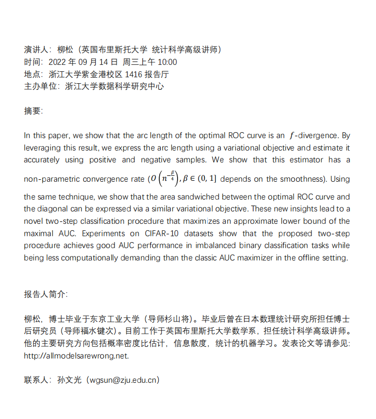 学术科研 学术团队 学术活动 学术会议 学术报告 讨论班 School Colloquium 信息公告 文件汇编 2022 乐竞官网平台 > Estimating the Arc Length of the Optimal ROC Curve and Lower Bounding the Maximal AUC 来源:乐竞(中国)一站式服务平台 发布时间:2022-09-14 334
