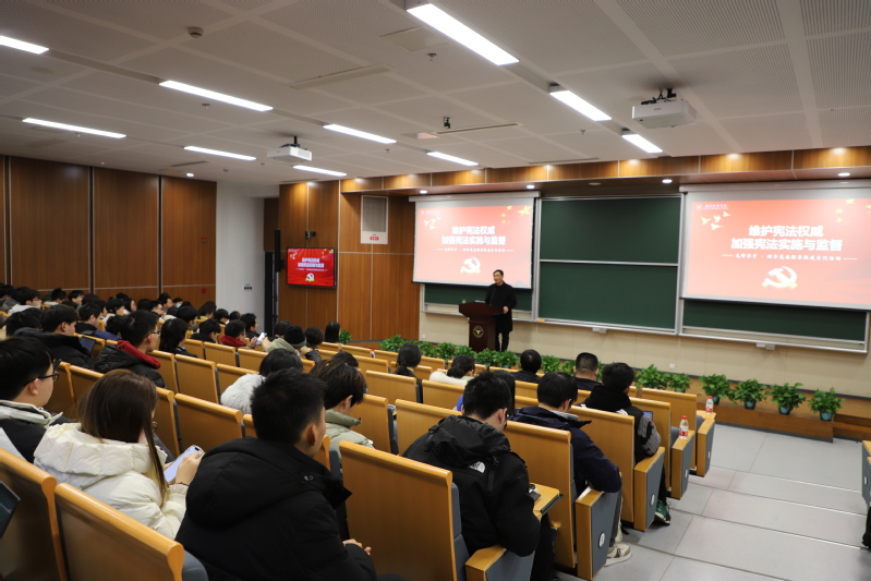 蔡晓卫以习近平总书记“宪法的生命在于实施,宪法的权威也在于实施”的重要论述引入,聚焦宪法的发展、我国宪法的性质和地位及加强宪法实施与监督等进行了深入细致、生动形象的阐述。从《共同纲领》到“八二宪法”,以及后续的多次修正,宪法作为治国理政的总章程,随着党领导人民建设中国特色社会主义实践的发展而不断完善发展,体现出党和人民事业的历史进步。宪法是国家的根本法,是党和人民意志的集中体现;是国家各项制度和法律法规的总依据;是实现国家认同、凝聚社会共识、促进个人发展的基本准则,是维系一个国家、一个民族凝聚力的根本纽带。在加强宪法实施与监督方面,要坚持以习近平法治思想为指导,坚持依宪治国、依宪执政。蔡老师向师生详细介绍了国家宪法日、宪法宣誓制度、合宪性审查机制、宪法等,以多个贴近日常,生动鲜活的案例深入浅出地阐释了完善宪法监督的重要意义和举措。