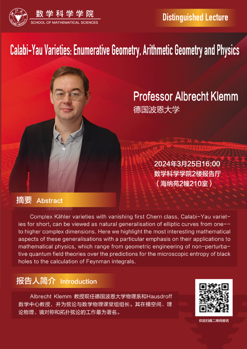 学术科研 学术团队 学术活动 学术会议 学术报告 讨论班 School Colloquium 信息公告 文件汇编 学术活动 乐竞官网平台 > Distinguished Lecture——Calabi-Yau Varieties: Enumerative Geometry, Arithmetic Geometry and Physics 来源:乐竞(中国)一站式服务平台 发布时间:2024-03-20 369