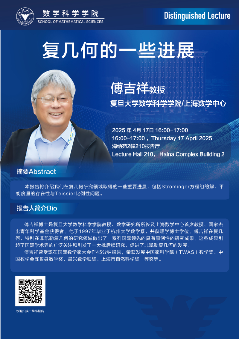 学术科研 学术团队 学术活动 学术会议 学术报告 讨论班 School Colloquium 信息公告 文件汇编 School Colloquium 乐竞官网平台 > Distinguished Lecture——复几何的一些进展 来源:乐竞(中国)一站式服务平台 发布时间:2025-04-11 26