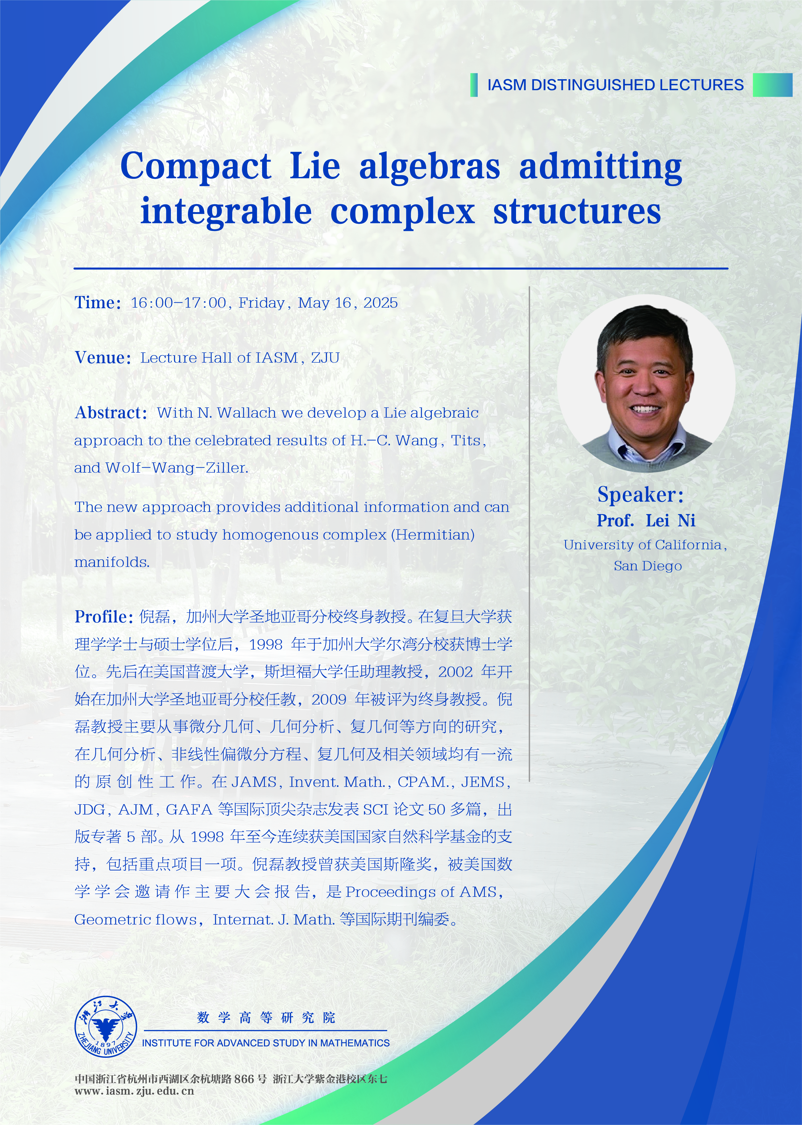 学术科研 学术团队 学术活动 学术会议 学术报告 讨论班 School Colloquium 信息公告 文件汇编 学术活动 乐竞官网平台 > IASM Distinguished Lectures——Compact Lie algebras admitting integrable complex structures 来源:乐竞(中国)一站式服务平台 发布时间:2025-05-16 133