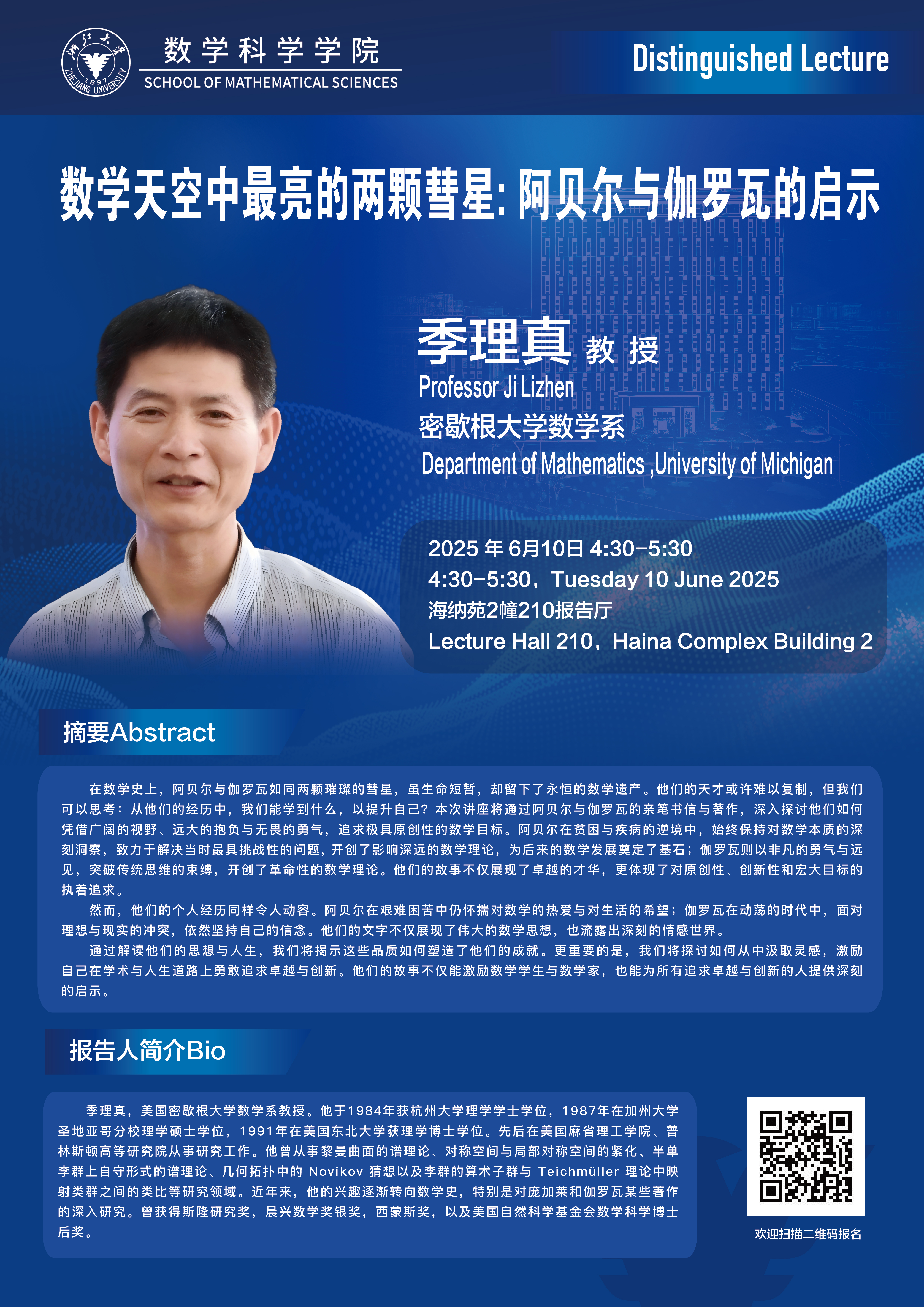学术科研 学术团队 学术活动 学术会议 学术报告 讨论班 School Colloquium 信息公告 文件汇编 学术活动 乐竞官网平台 > Distinguished Lecture——数学天空中最亮的两颗彗星: 阿⻉尔与伽罗⽡的启示 来源:乐竞(中国)一站式服务平台 发布时间:2025-06-07 331