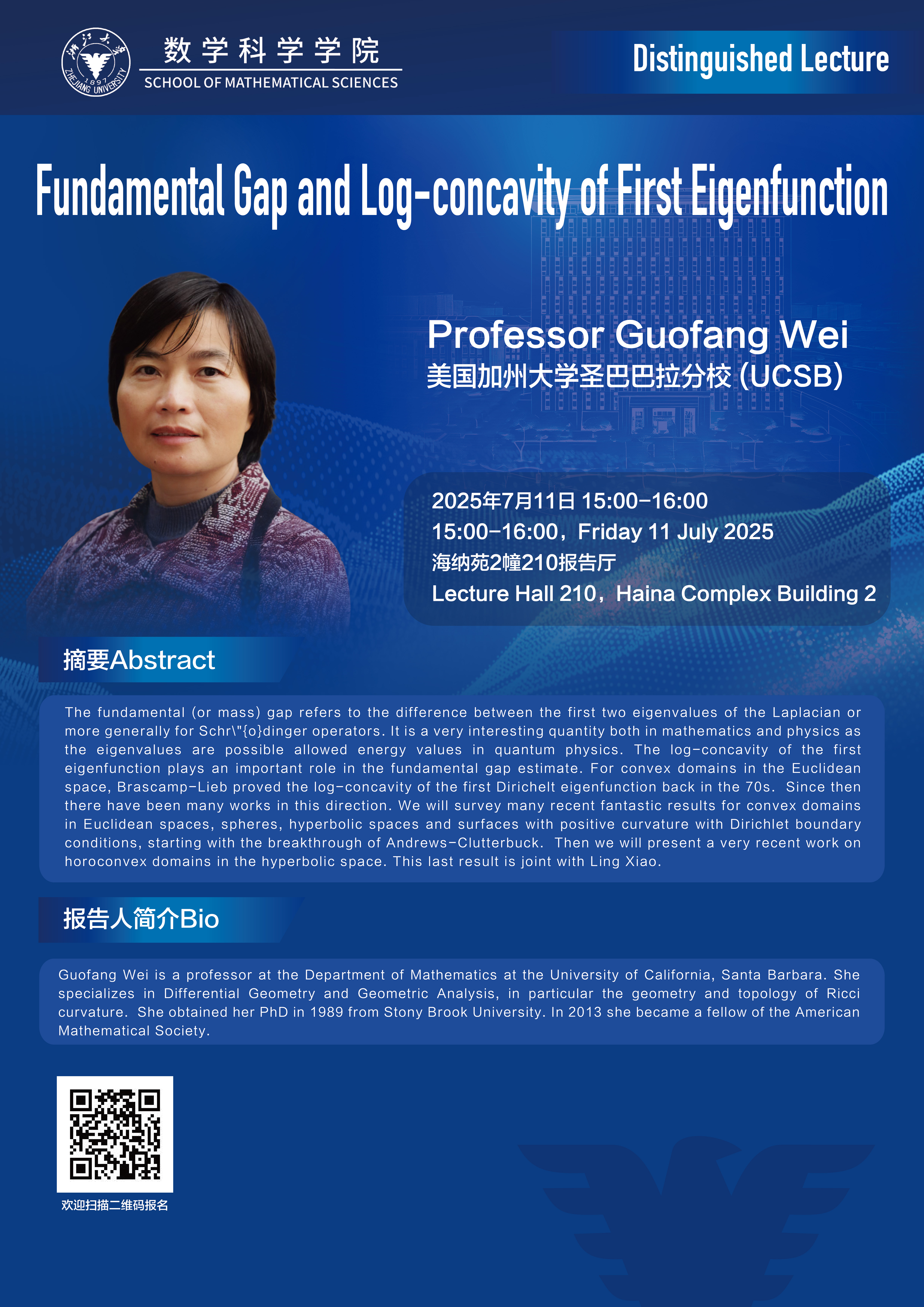 学术科研 学术团队 学术活动 学术会议 学术报告 讨论班 School Colloquium 信息公告 文件汇编 School Colloquium 乐竞官网平台 > Distinguished Lecture——Fundamental Gap and Log-concavity of First Eigenfunction 来源:乐竞(中国)一站式服务平台 发布时间:2025-07-09 18