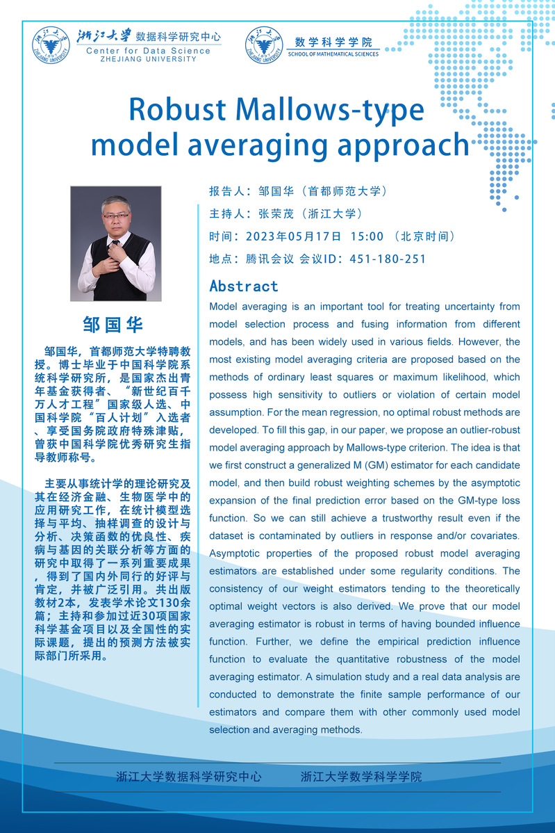 Seminars Seminars School Colloquium Conferences Position : homepage EVENTS Seminars Robust Mallows-type model averaging approach 2023-05-17 15:00:00 2023-05-17 15:00:00 2023-05-17 15:00:00 Speaker : 3:00PM, Zou Guohua Time : 2023-05-17 15:00:00 Location : May Date: 2023-05-11 Visitcount : 107