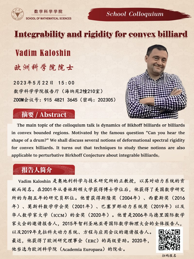 Seminars Seminars School Colloquium Conferences Position : homepage EVENTS Seminars School Colloquium:Integrability and rigidity for convex billiard 2023-05-22 15:00:00 2023-05-22 15:00:00 2023-05-22 15:00:00 Speaker : 3:00PM, Vadim Kaloshin Time : 2023-05-22 15:00:00 Location : May Date: 2023-05-19 Visitcount : 117